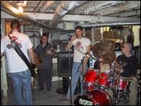 Above and below, "Living in Fear" jamming in the basement and then afterwards relaxing out in the laneway. In the bottom photo we have Tom, James (bass), Dave (drums), and Stan (leads). Summer 2001.